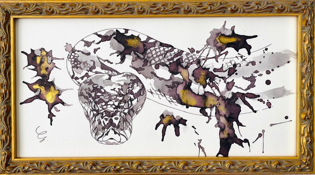 こちらはハイブリッド原画となります ペン画に日本画の画材(金泥)を使用していますので眼光や背景の植物がキラキラと輝きます なるべく自然色に見える環境で撮影しています キラキラしている部分は光の加減や肉眼で見るとさらに美しく輝きます ■ size 120×230mm ■ 額装あり