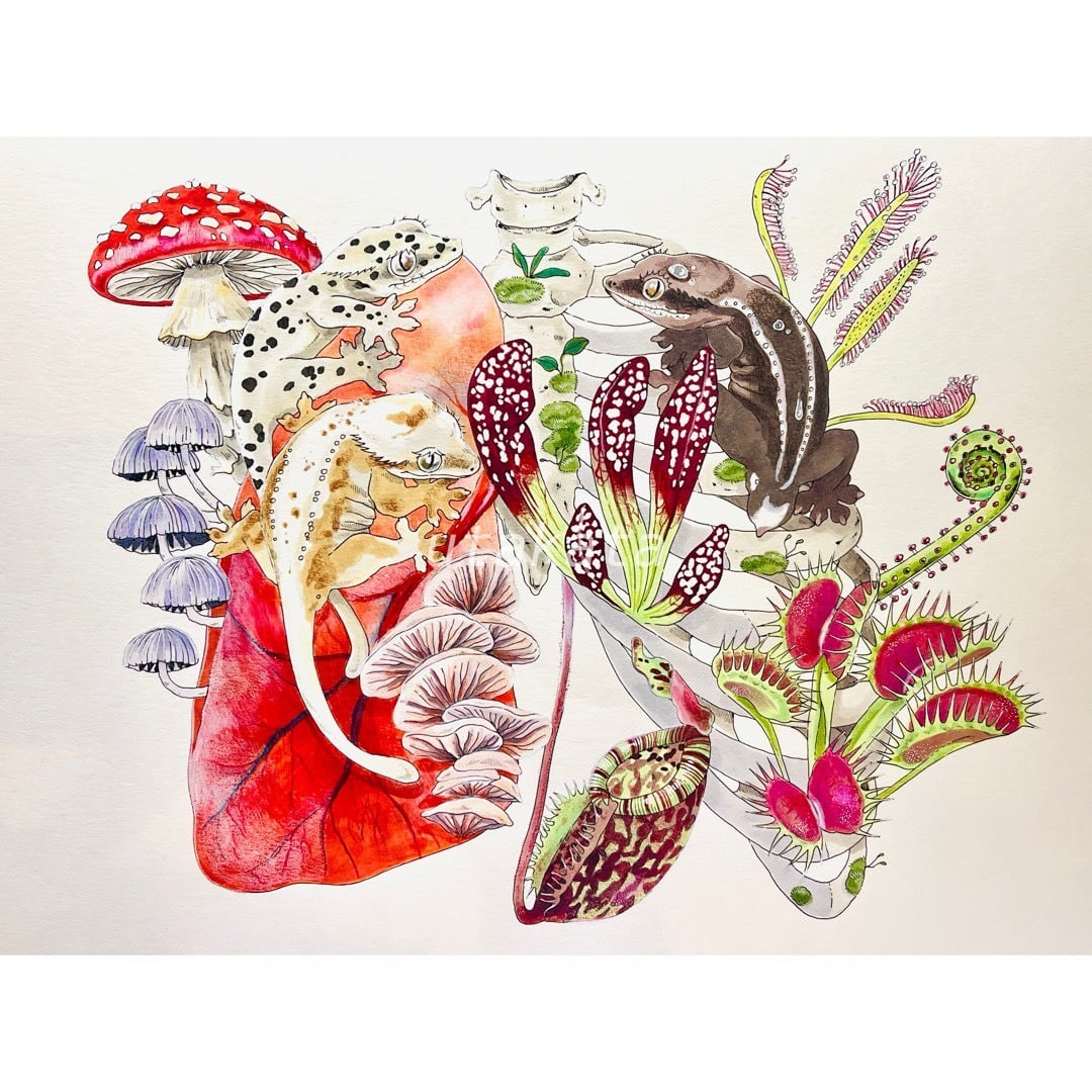 クレステッドゲッコーと食虫植物と肺とキノコを描いたトートバッグです