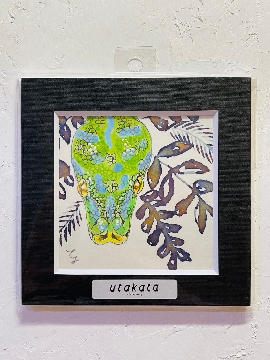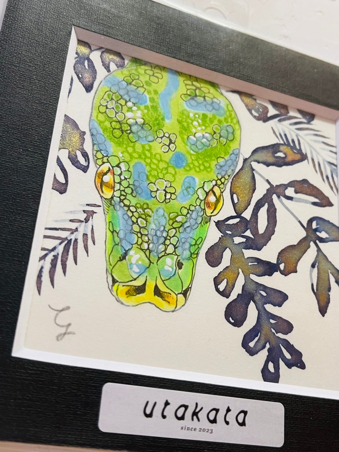 ペン画に日本画の画材(金泥)を使用していますので眼光や背景の植物がキラキラと輝きます