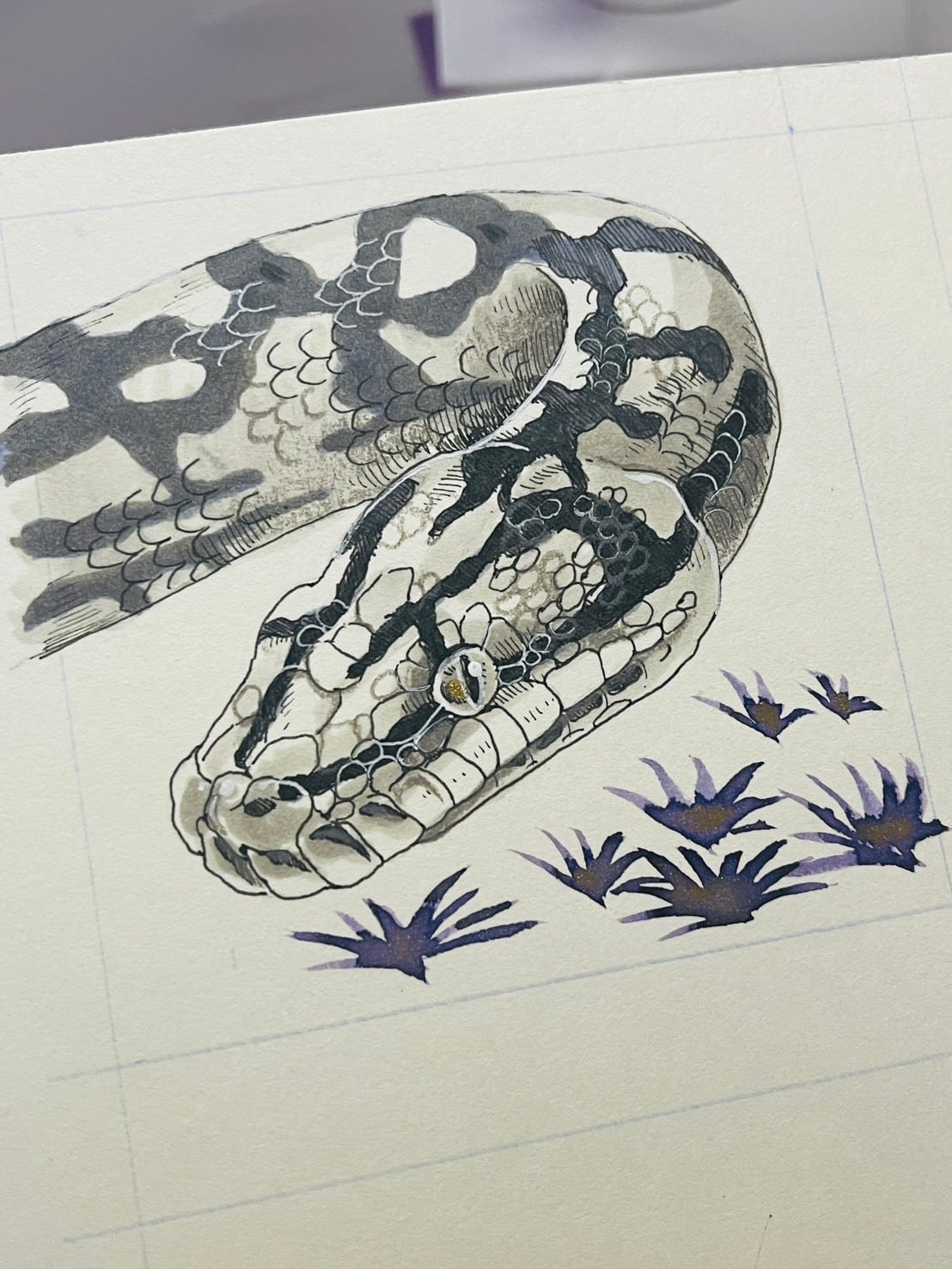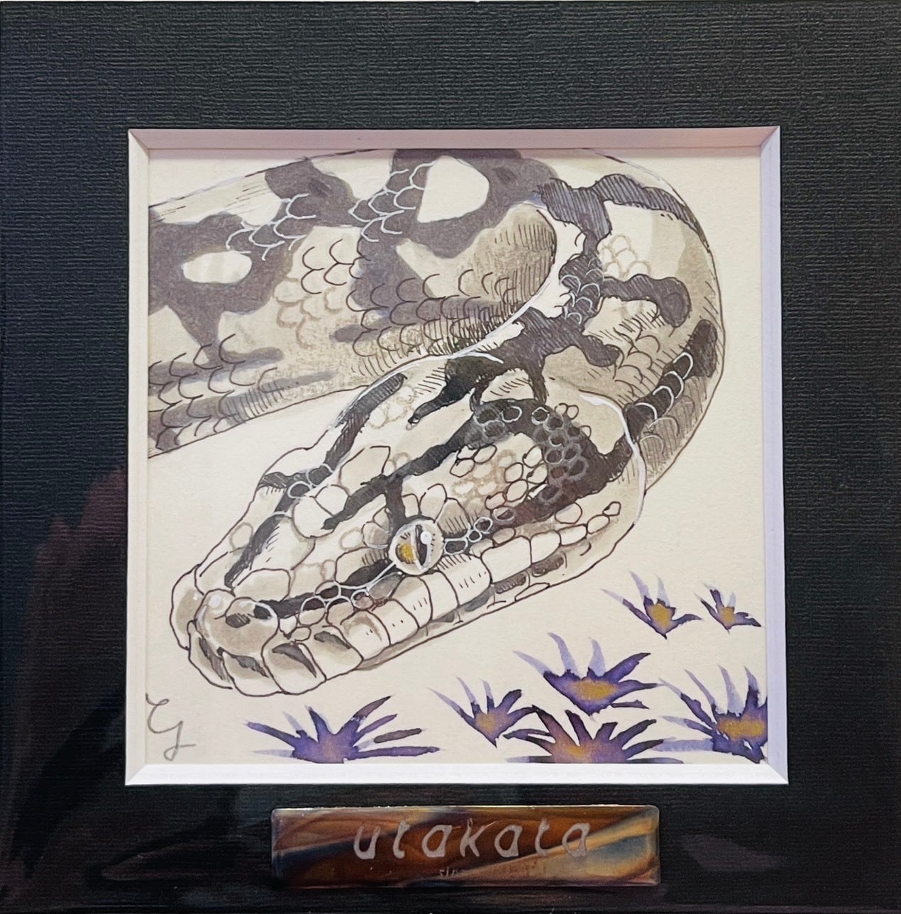ペン画に日本画の画材(金泥)を使用していますので眼光や背景の植物がキラキラと輝きます