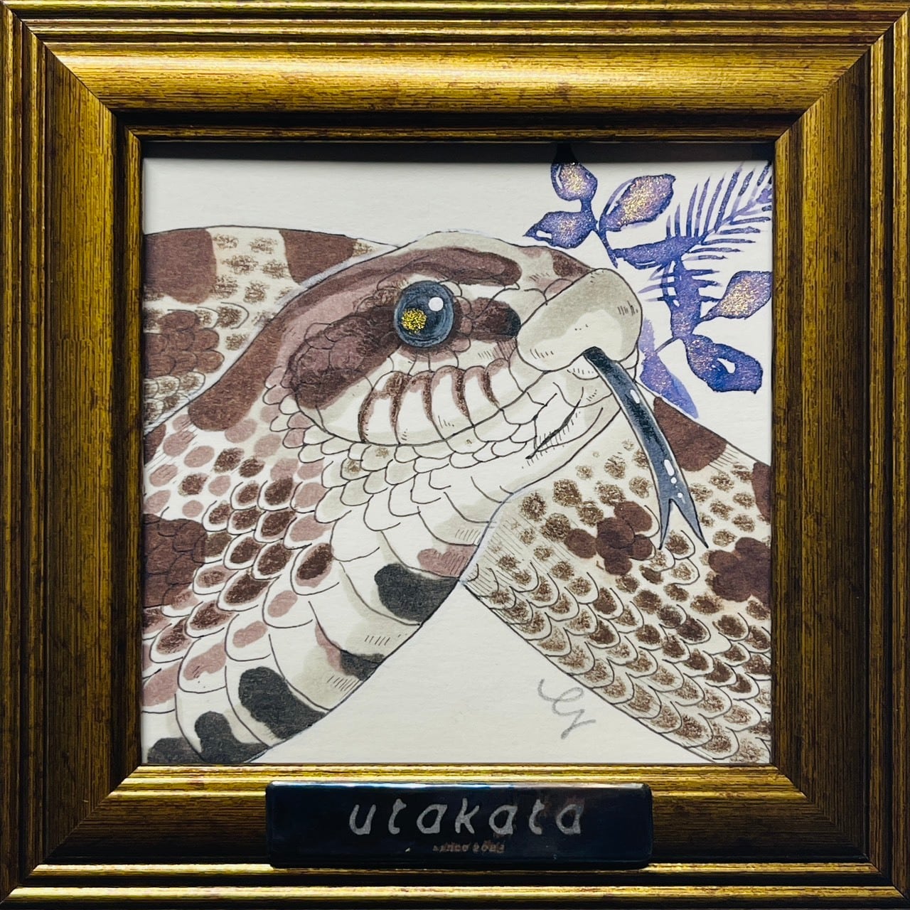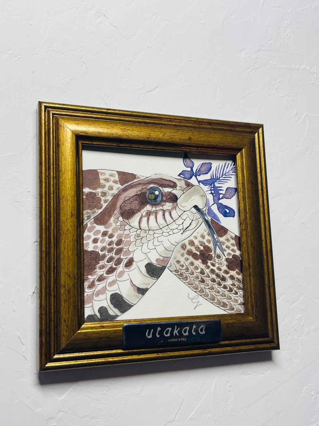 ペン画に日本画の画材(金泥)を使用していますので眼光や背景の植物がキラキラと輝きます