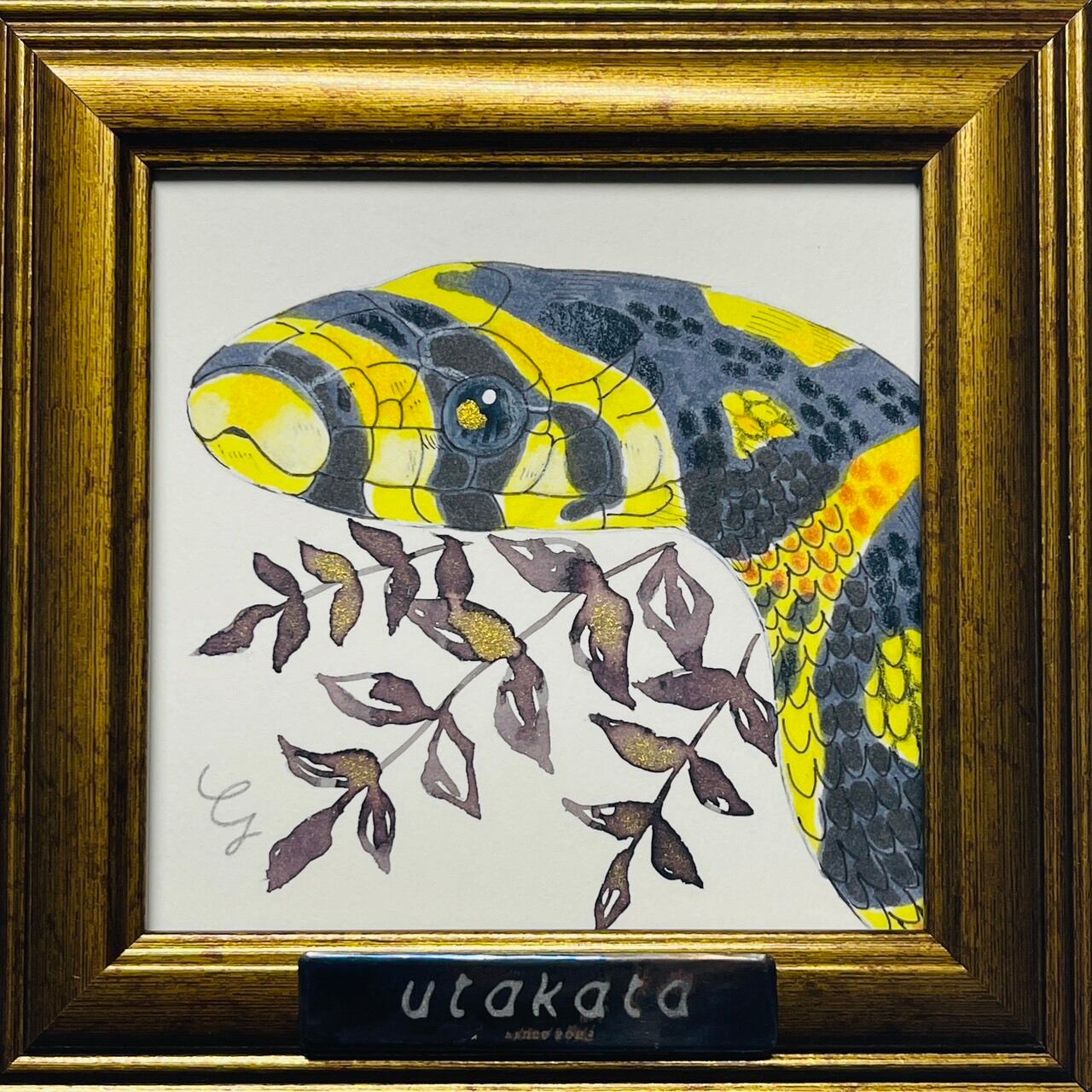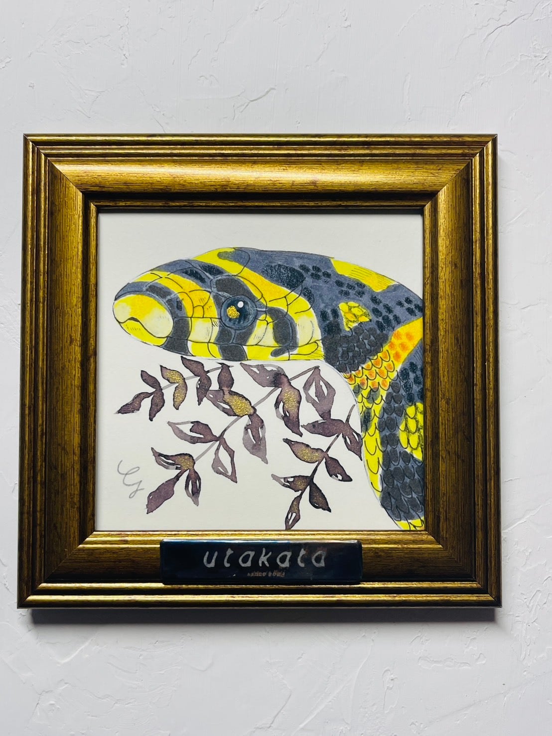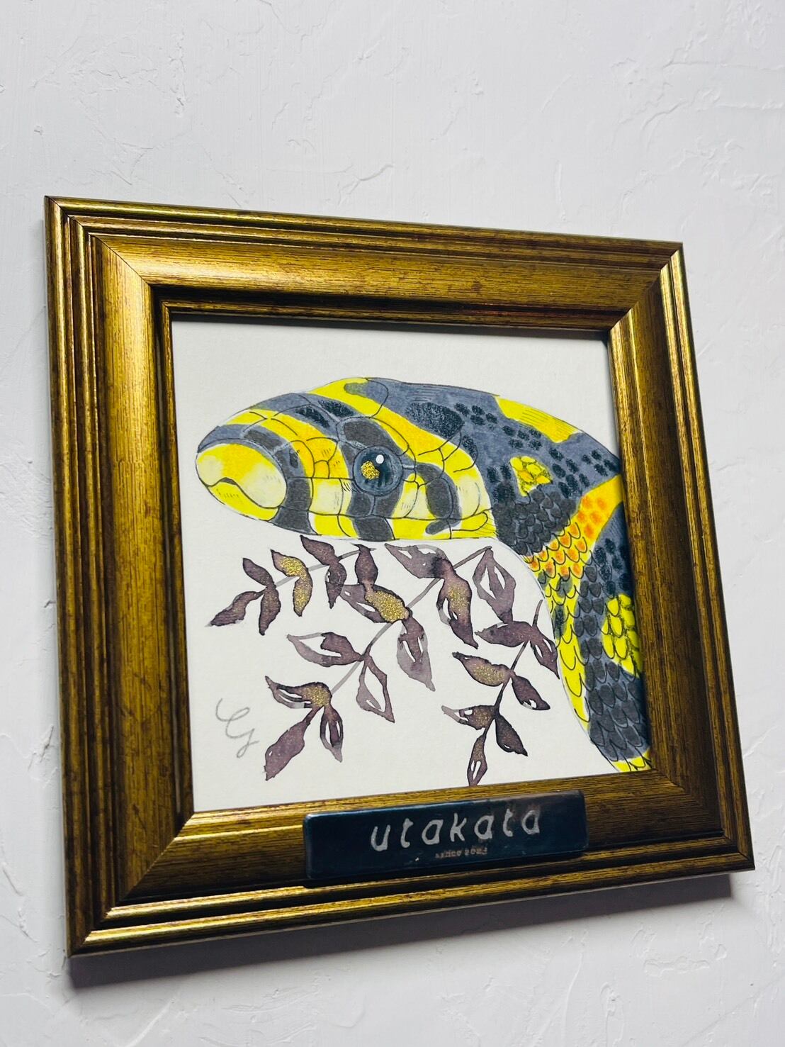 ペン画に日本画の画材(金泥)を使用していますので眼光や背景の植物がキラキラと輝きます