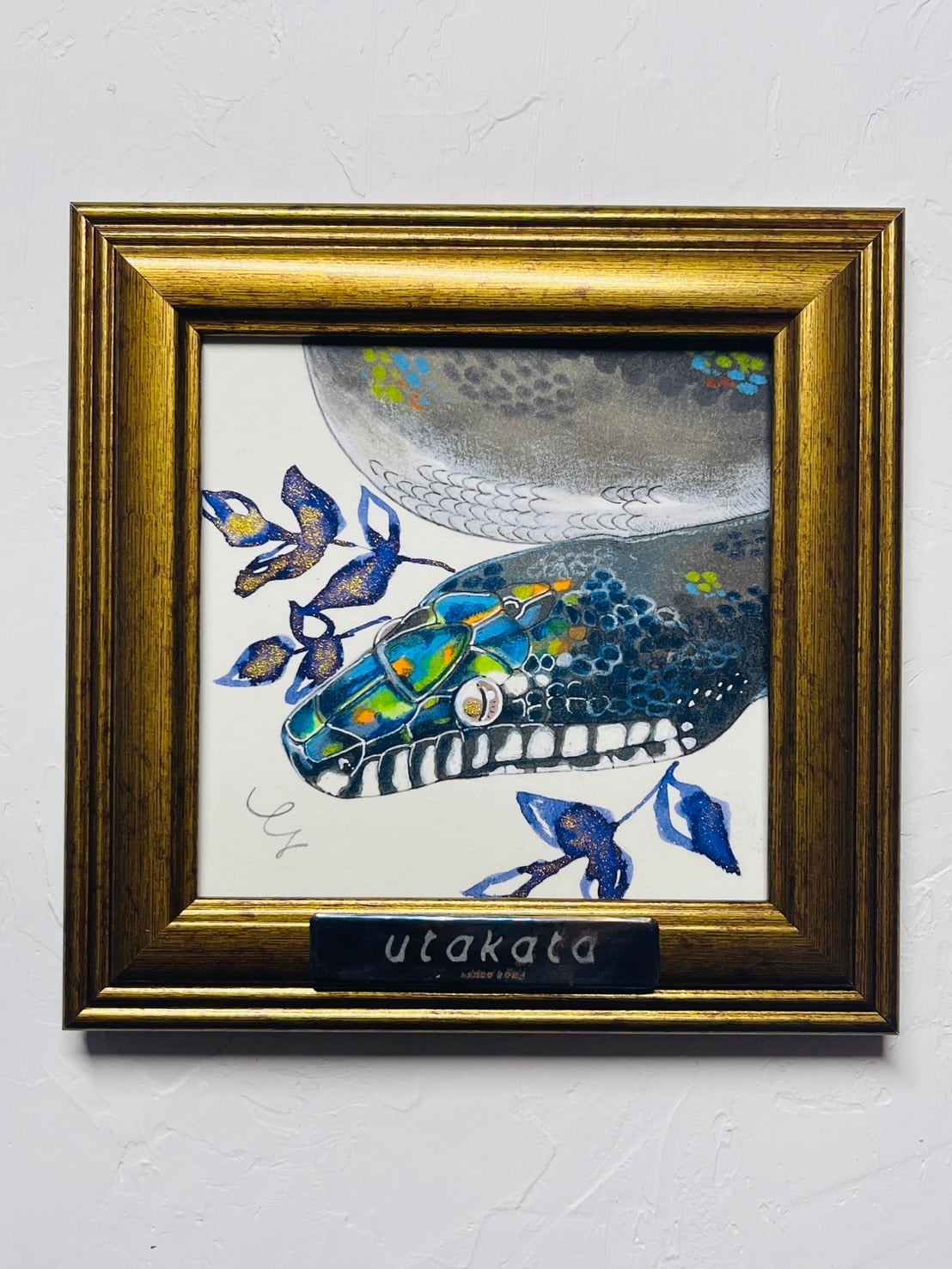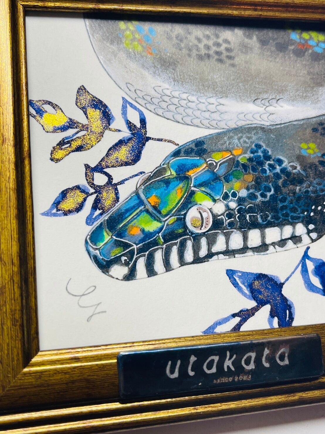 ペン画に日本画の画材(金泥)を使用していますので眼光や背景の植物がキラキラと輝きます