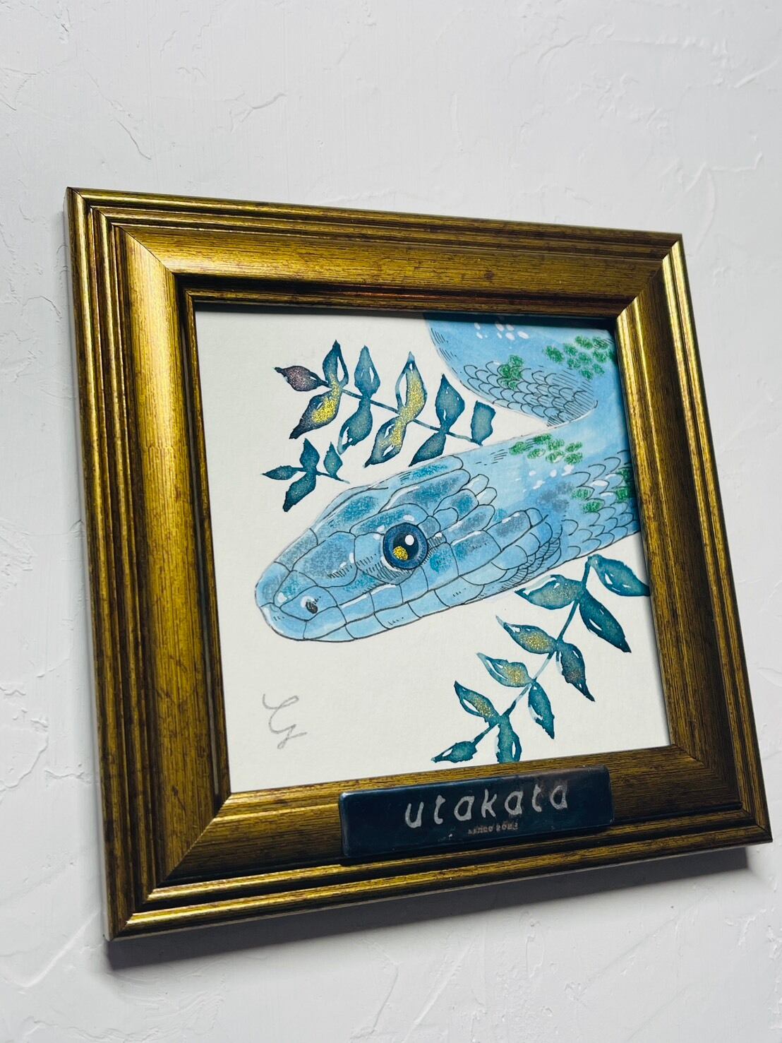 ペン画に日本画の画材(金泥)を使用していますので眼光や背景の植物がキラキラと輝きます