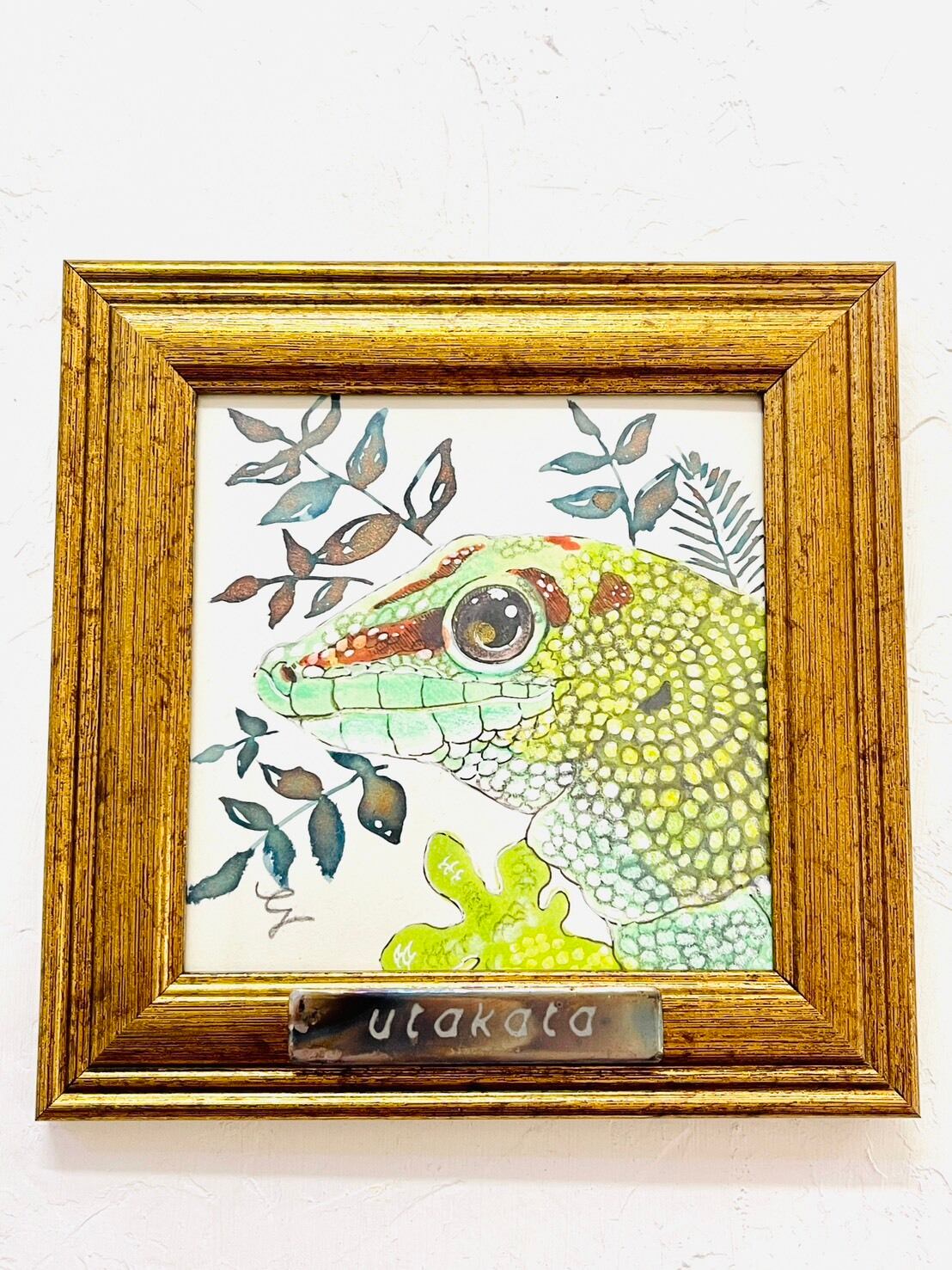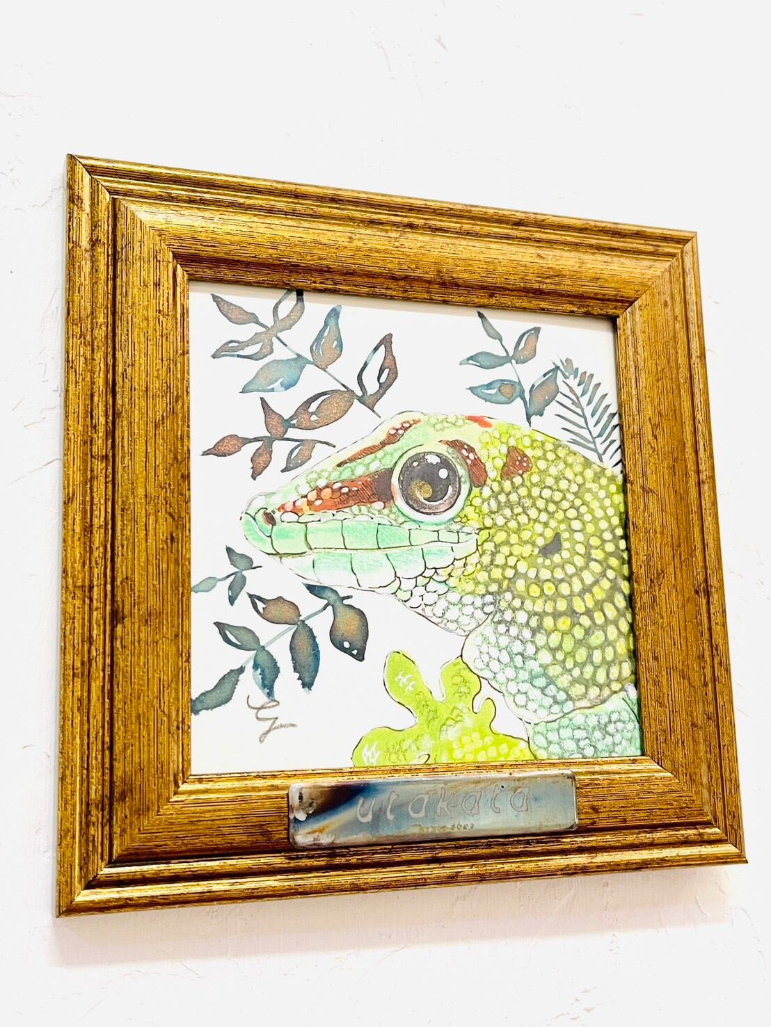 ペン画に日本画の画材(金泥)を使用していますので眼光や背景の植物がキラキラと輝きます